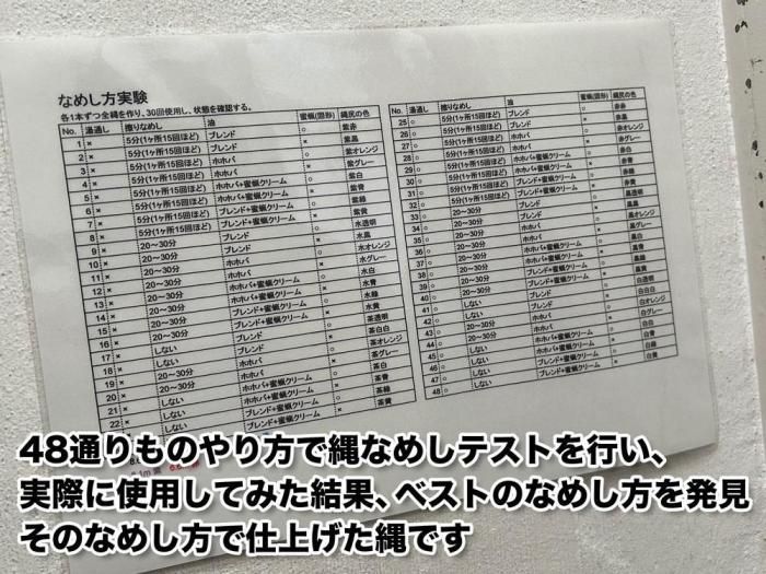 48通りものやり方で縄なめしテストを行い、実際に使用してみた結果、ベストのなめし方を発見しました。なめし方を行った縄をお届けいたします。